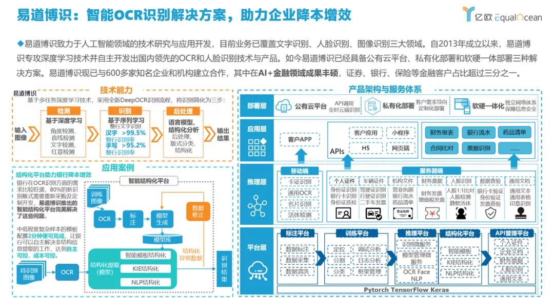 作為AI與金融結合的成功商業案例,易道博識在核心技術保持高強度投入,一直專注致力于人工智能領域的技術研究與應用開發,立足服務于銀行、證券、保險等行業領域,圍繞支撐業務建立了從平臺層、推理層、應用層到部署層的完整產品架構和服務體系。