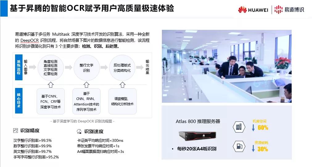 其中,在易道博識和華為昇騰合作開發(fā)的Atlas系列推理服務器中,易道博識的Deep OCR深度學習核心算法,為Atlas 800推理服務器提供了“每秒20張A4紙”量級的文本識別能力,因性能提高帶來的資源節(jié)省使得機房空間下降了60%,資源能耗下降了30%。