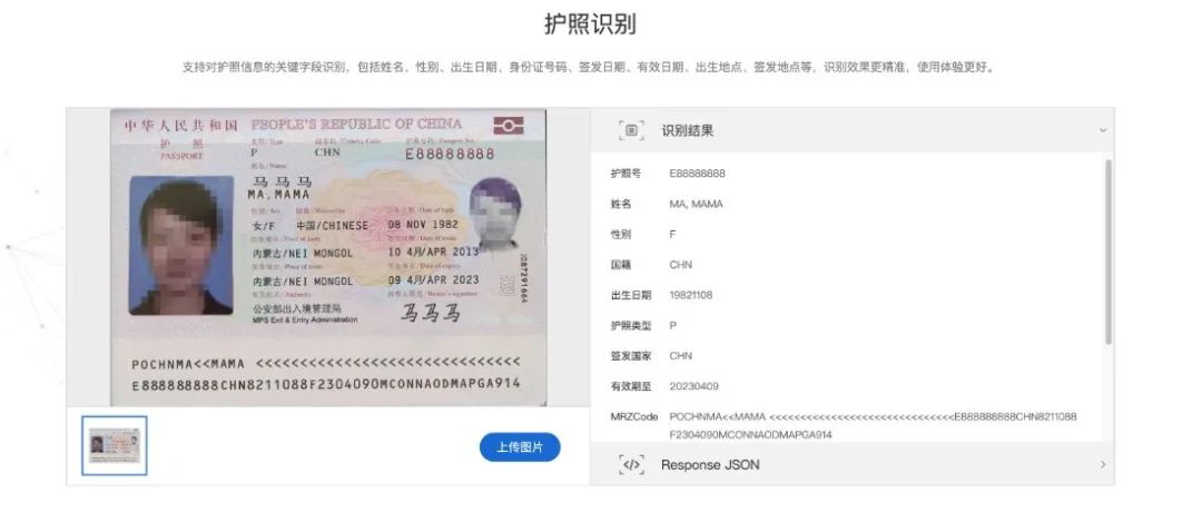 支持對(duì)護(hù)照國(guó)家碼、護(hù)照號(hào)、姓名、姓名拼音、性別、出生地點(diǎn)、出生日期、簽發(fā)地點(diǎn)、簽發(fā)日期、有效期、簽發(fā)機(jī)關(guān)等全字段信息識(shí)別輸出。