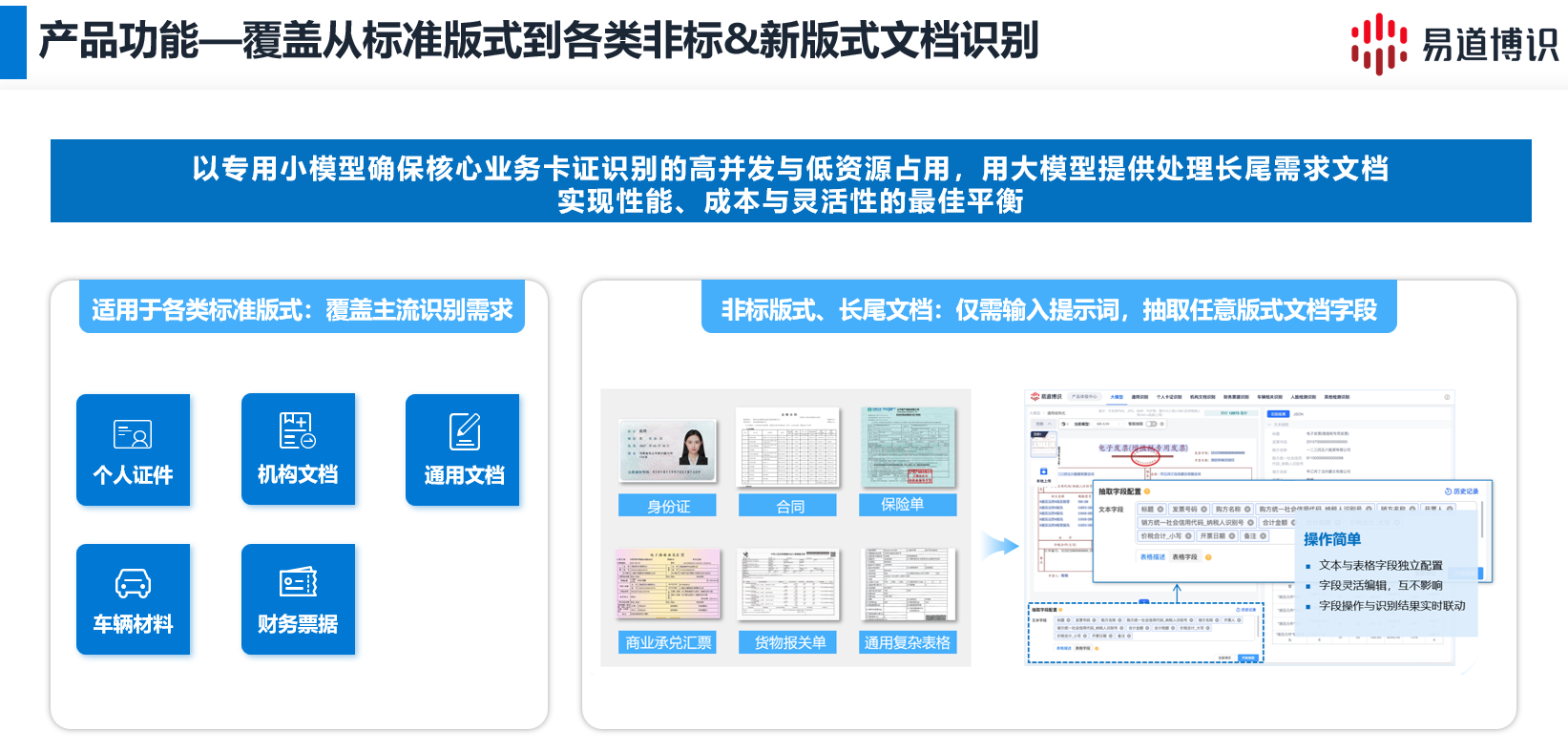 ● 專用小模型,識別高頻文檔:針對版式固定、處理頻率極高的核心業務文檔,如身份證、銀行卡、發票等,通過專用小模型進行識別,以極快的速度和極高的精度完成識別任務。