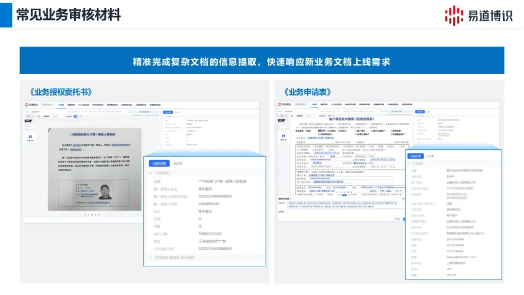 機(jī)構(gòu)開戶等需要批量上傳影像資料的場景中,業(yè)務(wù)人員只需將客戶提供的文件上傳,DeepIDP即可對影像進(jìn)行智能分揀和精準(zhǔn)歸類,自動識別出哪些是營業(yè)執(zhí)照,哪些是法人身份證,哪些是授權(quán)委托書,整個(gè)過程無需人工干預(yù)。