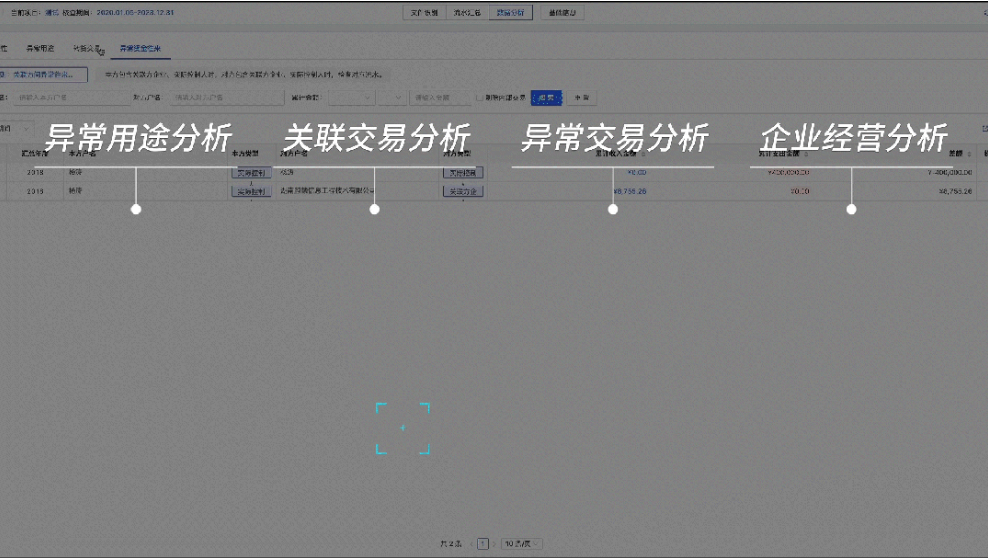 智能分析應用:系統(tǒng)提供異常用途分析、關(guān)聯(lián)交易分析、異常交易分析、企業(yè)經(jīng)驗分析,還支持自定義資金流向分析、未達賬項分析、銀行流水與財報數(shù)據(jù)比對分析等一系列智能分析應用,覆蓋了金融合規(guī)審計的方方面面,能根據(jù)各類風險特征,精準識別出潛在的違規(guī)違法行為。