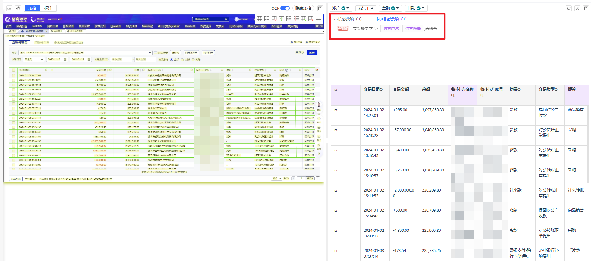 銀行流水記錄著企業(yè)經(jīng)營的軌跡,是企業(yè)盡調(diào)審核的重要依據(jù)。通過全面核查銀行流水,可還原企業(yè)日常運營、投融資、股權(quán)變更等活動的真實情況,從根本上防范注水造假等違法違規(guī)行為。然而,銀行流水OCR的高精度識別一直是制約金融機構(gòu)審計效率的行業(yè)痛點。在監(jiān)管趨嚴的大環(huán)境下,如何高效完成銀行流水核查,全面識別潛在風險,正成為金融機構(gòu)當務之急。