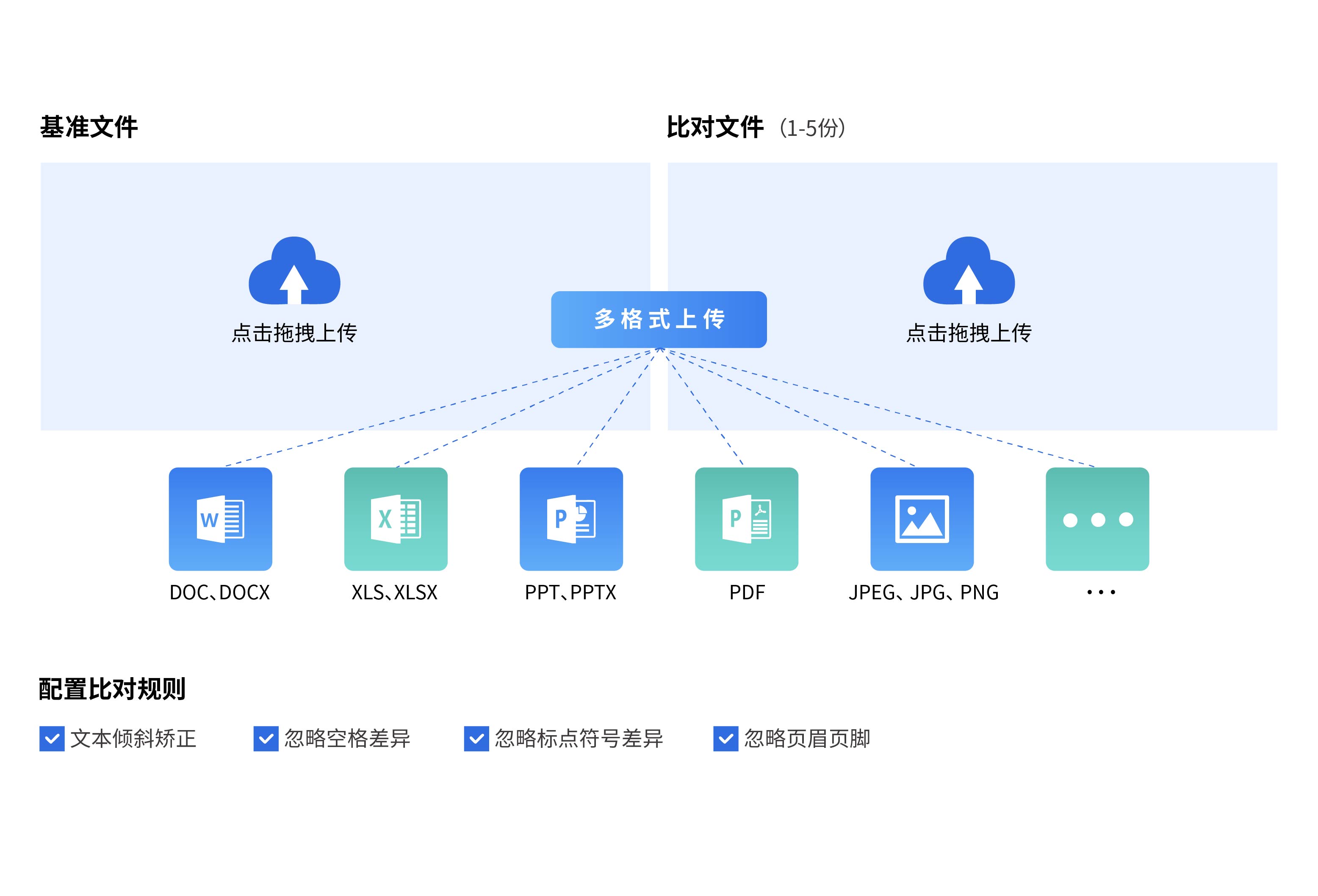 超強格式兼容: 支持DOC、DOCX、XLS、XLSX、PPT、PPTX、PDF等格式文件比對,支持JPEG、JPG、PNG、BMP等圖片格式。