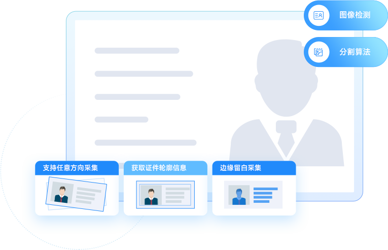 支持任意方向證件采集,基于深度學習的圖像檢測與分割算法能更好地排除背景噪聲的干擾,可準確獲取證件輪廓信息,邊緣留白采集,滿足監管要求。