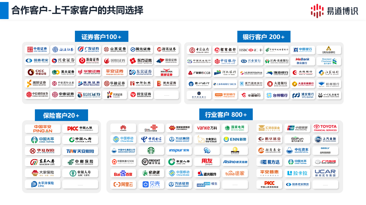 這些實實在在的數據,是易道博識技術實力與服務能力的最佳證明。目前,公司已服務包括超100家券商、超200家銀行以及上千家行業客戶,覆蓋了各行各業。