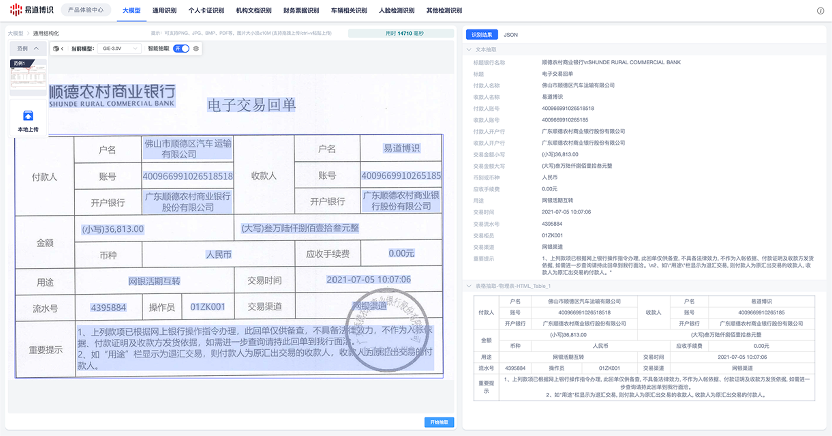 泛化能力強:大模型在新場景下的適應能力非常強。比如銀行交易回單,每家銀行的格式都不一樣,過去可能需要對每一種格式都做針對性的模型訓練,現在用大模型,不需要專門訓練,就能達到較為理想的識別效果。