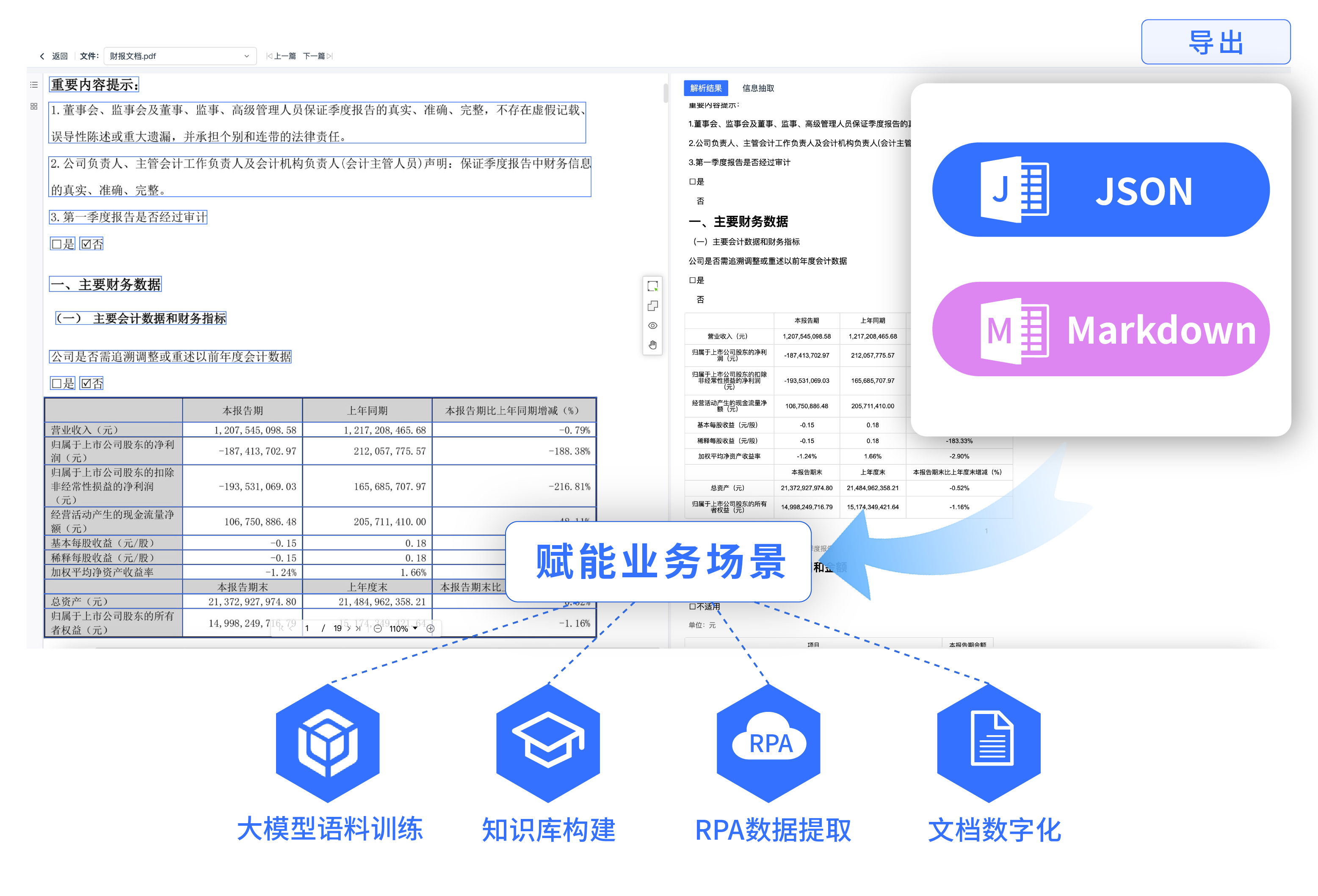 支持輸出Markdown和JSON格式,保留原始文檔的版式與內容。 支持大模型語料訓練、知識庫構建、RPA數據提取、文檔數字化等業務場景。