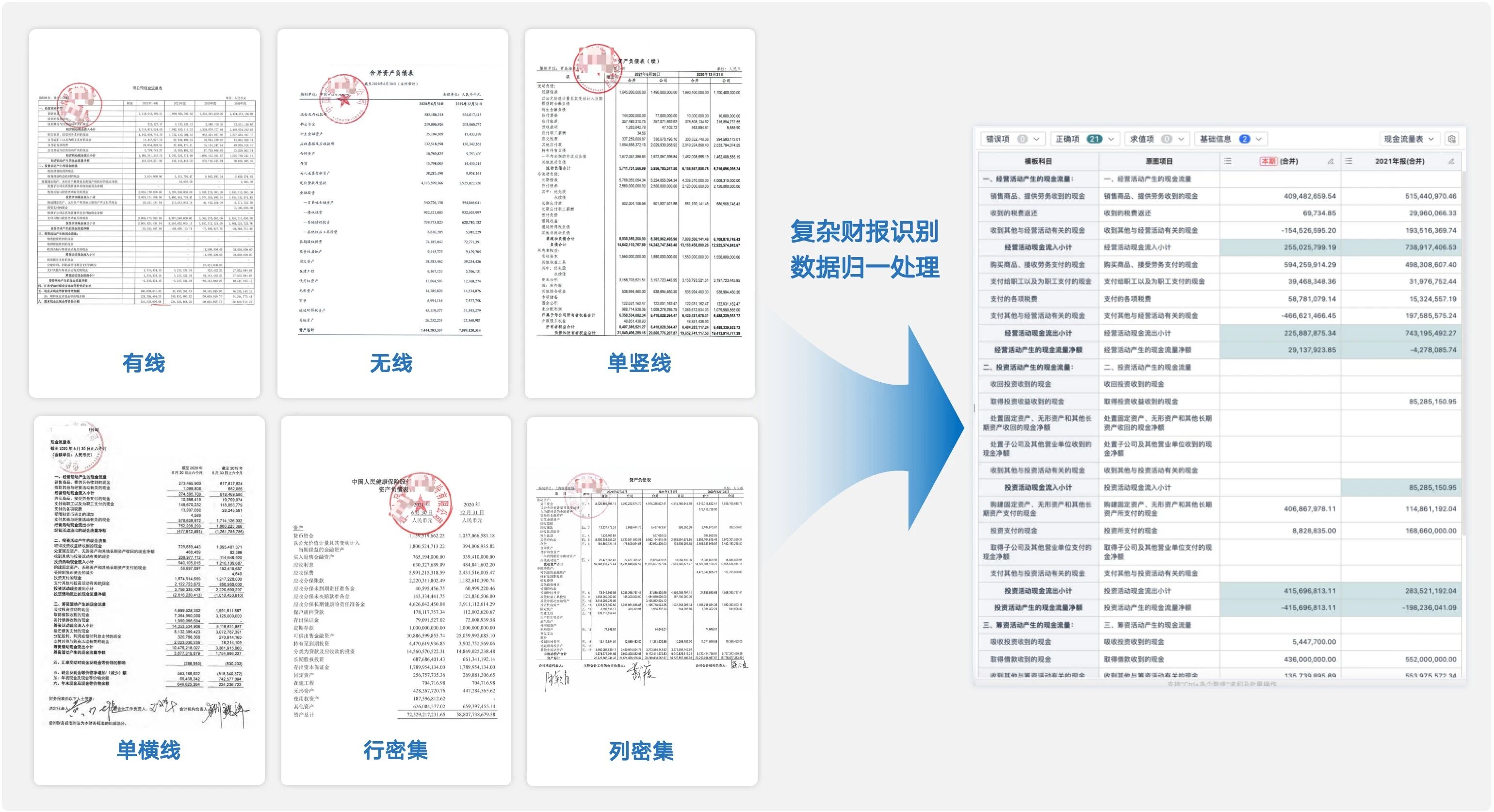 可兼容PNG、JPG、PDF、Excel以及zip壓縮包等多種格式,自動判斷報表類型,智能識別資產負債表、利潤表、現金流量表等財務報表,智能匹配模板科目。