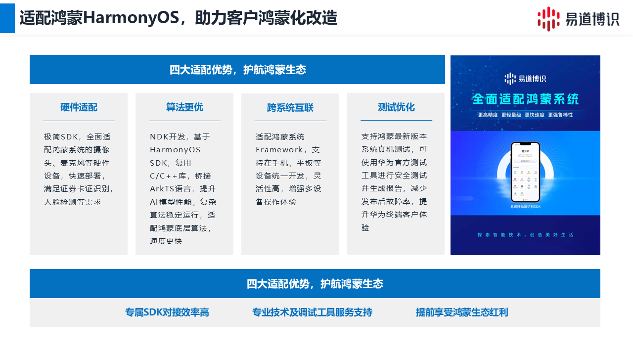 未來,易道博識將持續深化與鴻蒙生態的緊密合作,打造更專業便捷的智能識別方案,與鴻蒙生態并肩前行,共筑安全、純凈、繁榮的智慧新生態。