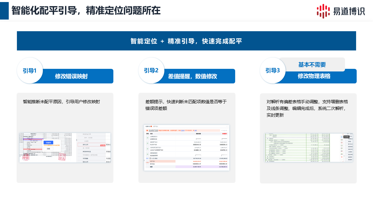 A:通過界面的智能化配平引導,系統允許用戶從“修改錯誤映射”、“依據差值提醒修改數值”,甚至“直接手動編輯原圖表格讓系統二次解析”三個層面向下調整歸一數據,過程可視化且步驟清晰。